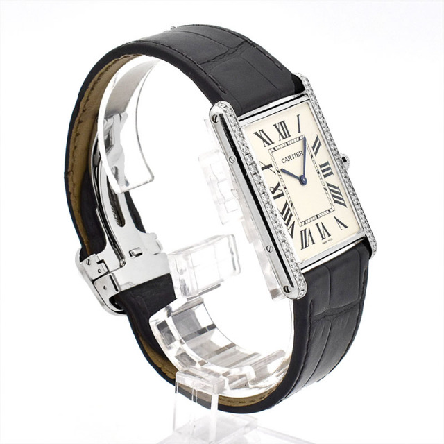 ホワイトゴールドケースにダイヤモンドがセッティングされたカルティエらしい品の有るモデルです。